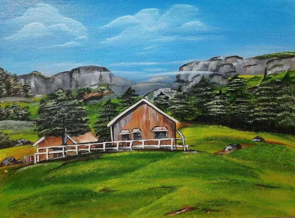 It is a breathtaking acrylic painting that immerses you in the serene embrace of nature. The artwork showcases a rustic cottage nestled among towering mountains and a tranquil forest. The interplay of light and shadow highlights the cottage’s cozy presence against the majestic backdrop of rugged peaks. The cool, misty atmosphere and the rich, earthy colors create an ambiance of quietude and solitude. This painting encapsulates the harmonious coexistence of human habitation and untamed wilderness, inviting viewers to embark on an imaginary journey of tranquility and natural beauty. It’s a visual escape to a world where mountains and forests harmoniously converge, offering a sense of peace and wonder.