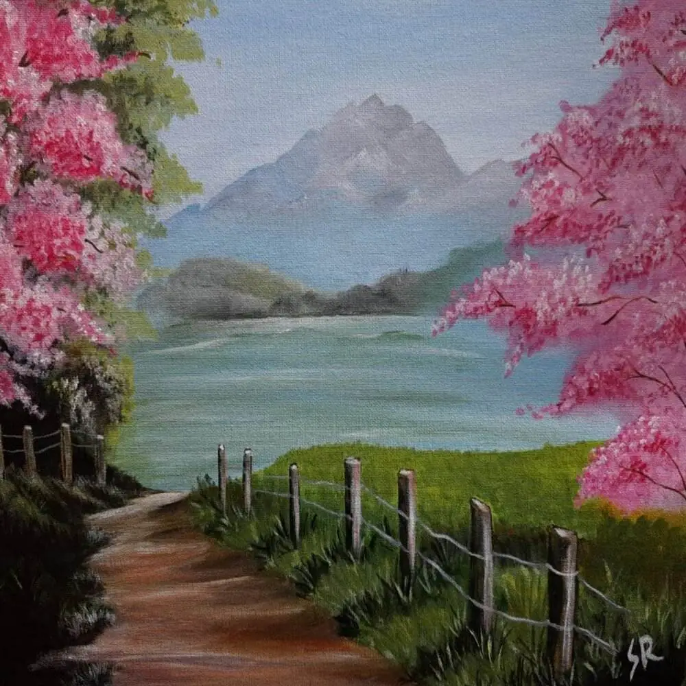 “A serene mountain lake, with its deep blue waters, is encircled by a forest of trees adorned with delicate pink blossoms. The artist skillfully captures the serene beauty of the landscape, balancing the vivid hues of the lake and the soft, dreamy pink tones of the trees, creating a visually captivating and tranquil scene that transports the viewer to a world of natural wonder.”