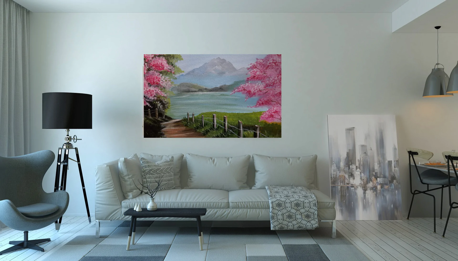 In the Pink Spring Blooms acrylic painting, nature’s exuberance bursts forth in a symphony of delicate hues and vibrant energy. Soft strokes of rose and blush intertwine with hints of pale green, creating a mesmerizing dance of color on the canvas. Each meticulously crafted petal seems to sway in the gentle breeze, radiating a sense of ephemeral beauty and joyous renewal. The artist’s skillful use of light and shadow adds depth and dimension, evoking a serene yet dynamic atmosphere. With every brushstroke, the painting captures the essence of springtime awakening, inviting viewers to immerse themselves in its enchanting embrace.