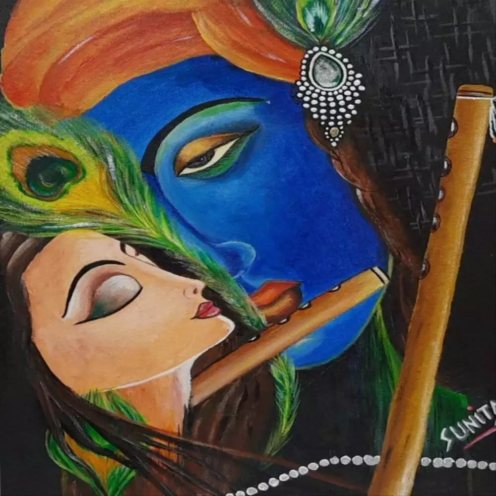 A Radha Krishna acrylic painting is a vibrant and visually striking artwork that typically depicts the Hindu deities Lord Krishna and Radha, who are central figures in Hindu mythology and symbolize love, devotion, and divine union. These paintings often feature a blend of rich colors and intricate details, with Krishna portrayed as a blue-skinned god playing the flute and Radha as his beloved, often dressed in traditional Indian attire. Acrylic paint is commonly used in these artworks due to its versatility, allowing for bold and intense colors, fine details, and a sense of depth. Radha Krishna acrylic paintings are often used as decorative art pieces in homes, temples, and spiritual spaces, celebrating the divine love and spiritual connection between the two iconic figures.